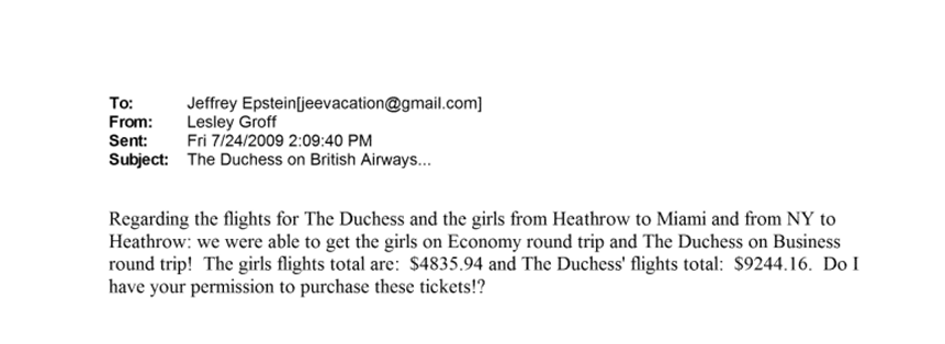 Σε email του 2009 αναφέρεται ότι ο Έπσταϊν πιθανότατα πλήρωσε πτήσεις για «τη δούκισα και τα κορίτσια, από το Χίθροου στο Μαϊάμι», προφανής αναφορά στη Σάρα Φέργκιουσον και τις κόρες της, πριγκίπισσες Ευγενία και Βεατρίκη.