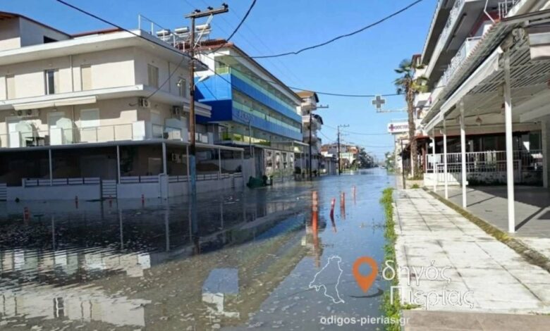 Προβλήματα προκάλεσε η κακοκαιρία στην Παραλία Κατερίνης, με τη θάλασσα να βγαίνει στη στεριά και να πλημμυρίζει δρόμους και μαγαζιά.
