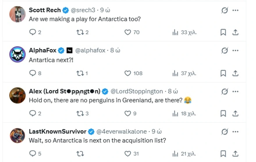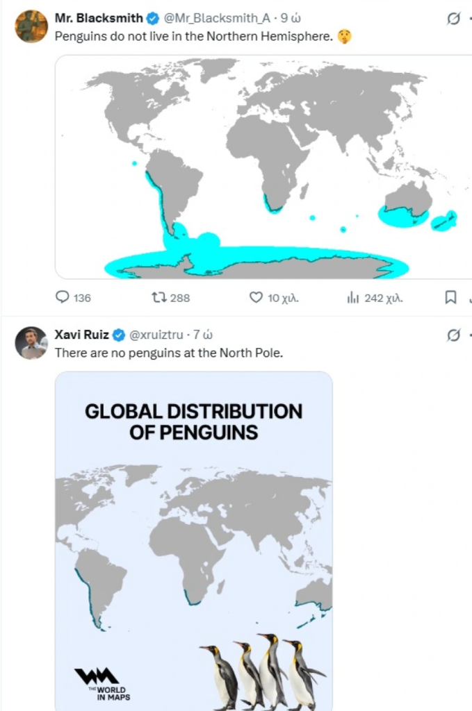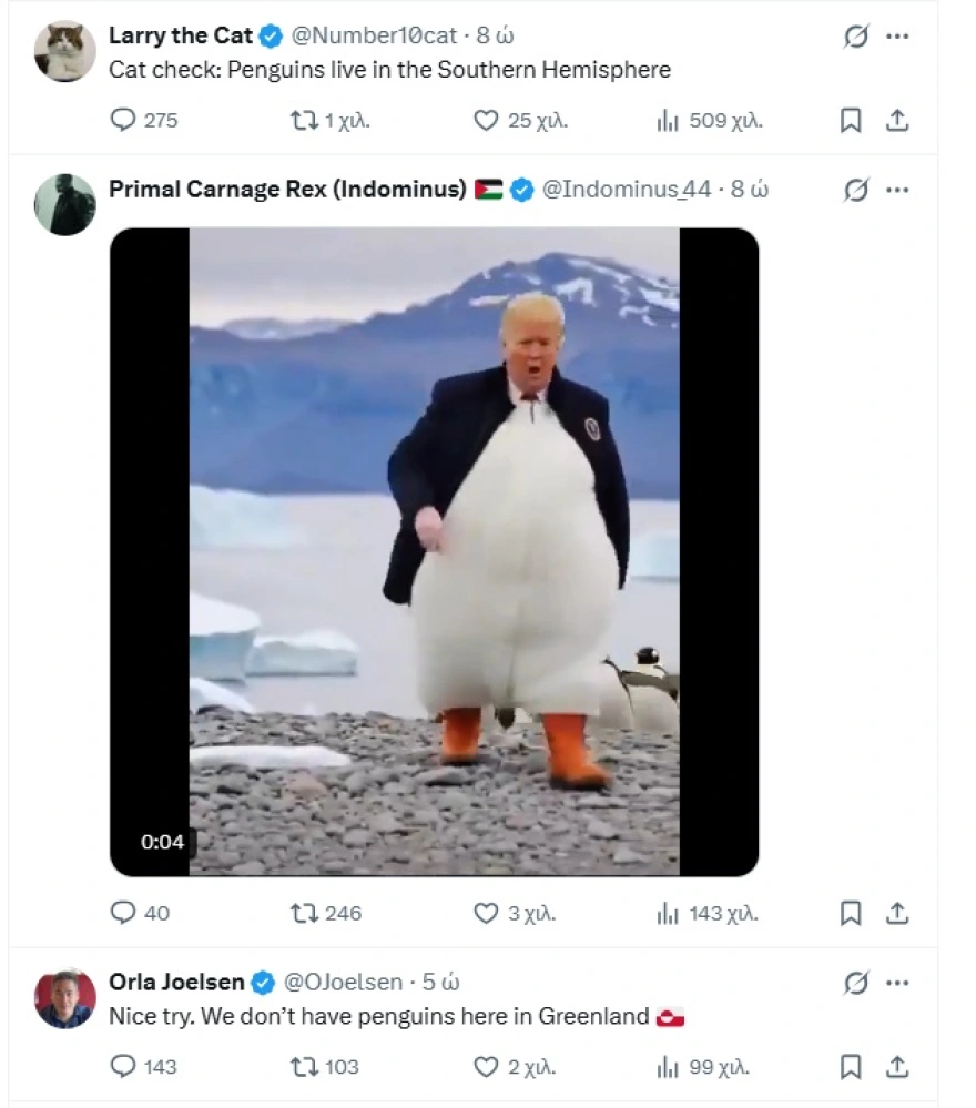 Και αν το μήνυμα που στέλνουν οι συγκεκριμένες αναρτήσεις είναι, από μόνο του, αρκετό από μόνο του για να κινητοποιήσει αρνητικά σχόλια, η παρουσία του πιγκουίνου εντείνει ακόμη περισσότερο τις αντιδράσεις. Ο λόγος; «Λάθος ημισφαίριο, δεν υπάρχουν πιγκουίνοι στο Βόρειο Ημισφαίριο, δεν υπάρχουν πιγκουίνοι στη Γροιλανδία» γράφουν οι περισσότεροι χρήστες που σχολιάζουν την ανάρτηση, προσθέτοντας πως «οι πιγκουίνοι ζουν αποκλειστικά στο Νότιο».