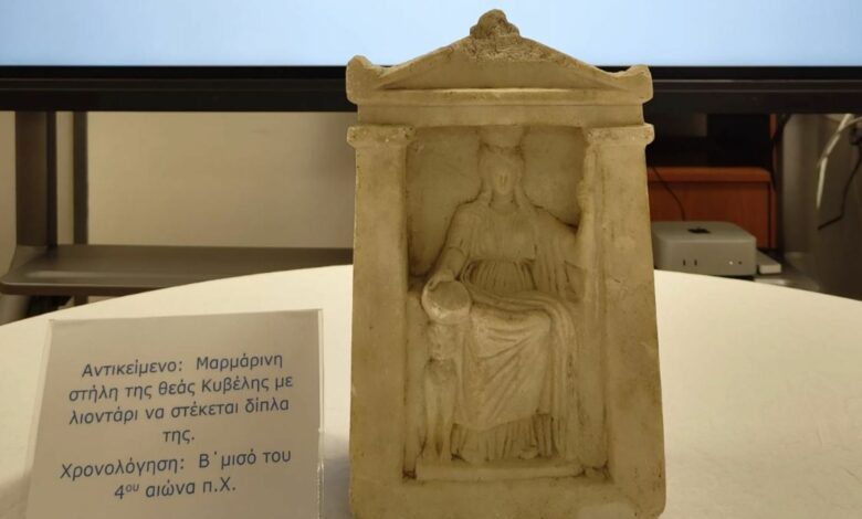 Στο πλαίσιο της έρευνας, εντοπίστηκε κρυμμένη σε πατάρι και κατασχέθηκε μια μαρμάρινη ναόσχημη αναθηματική στήλη (ένθρονη θεά Κυβέλη με ένα λιοντάρι δίπλα της), η οποία χρονολογείται στον 4ο π.Χ. αιώνα.