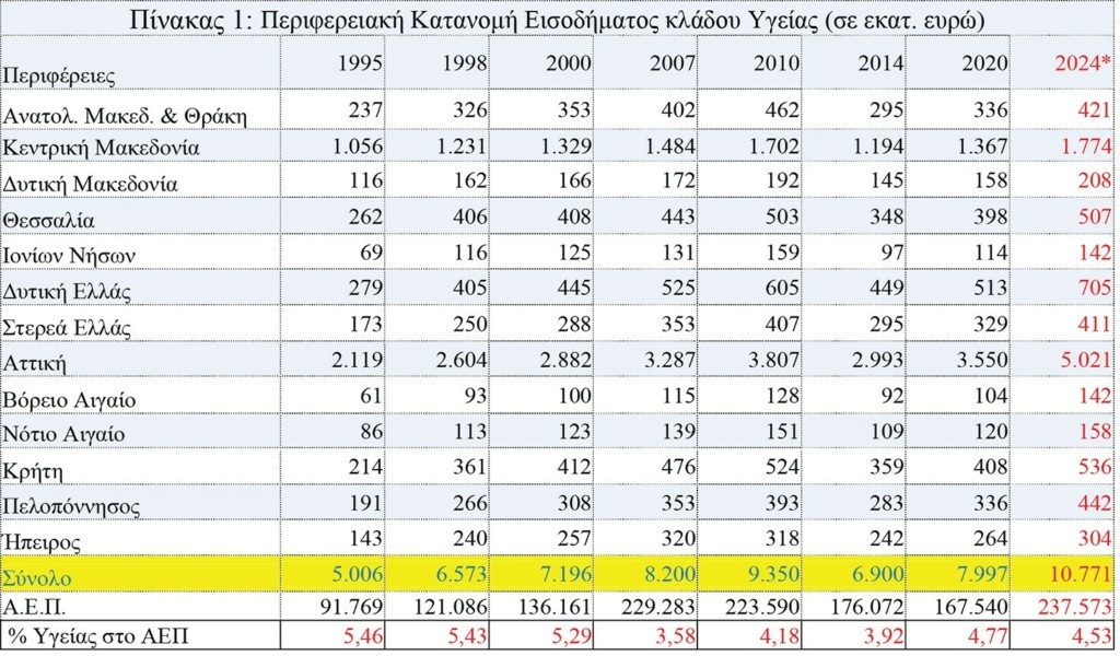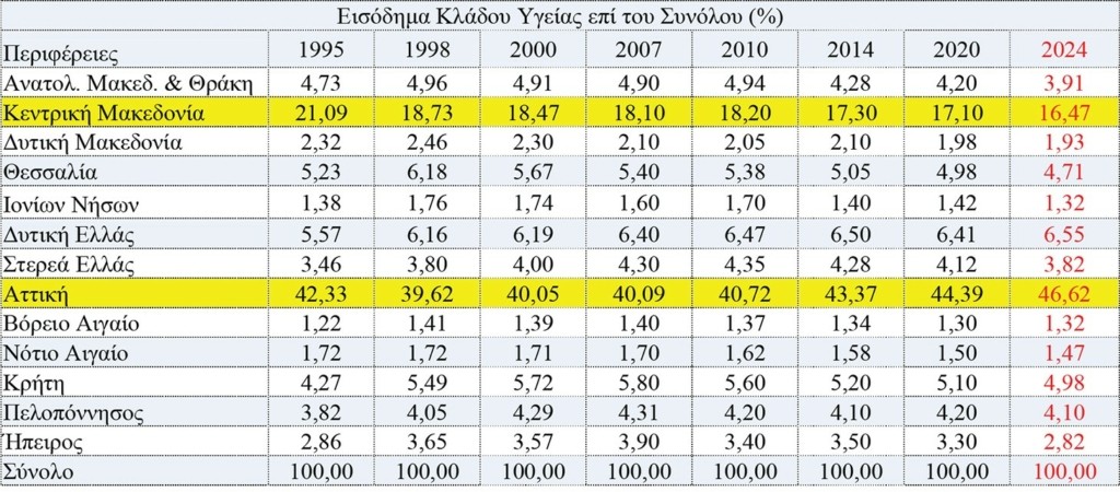 Με βάση τα ανωτέρω, το ποσοστό του εισοδήματος του τομέα υγείας θα συρρικνωθεί· ενώ το 1995 ανερχόταν στο 5,5% (Πίνακας 1) από το 2032 θα κινηθεί πέριξ του 3% με όλες τις συνέπειες για την περαιτέρω αποσάθρωση του συστήματος υγείας, ενώ η συγκέντρωση του πληθυσμού στην Αττική και τη Θεσσαλονίκη θα μειώνει έτι περισσότερο το προϊόν της υγείας στην περιφέρεια. Όθεν, και η συνολική κατάσταση το 2032, τηρουμένης της ασκουμένης πολιτικής, θα καταστεί δυσβάστακτος.