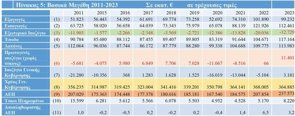 Στον Πίνακα 5 χαρτογραφούνται τα βασικά μεγέθη της ελληνικής οικονομίας (2011-2023.