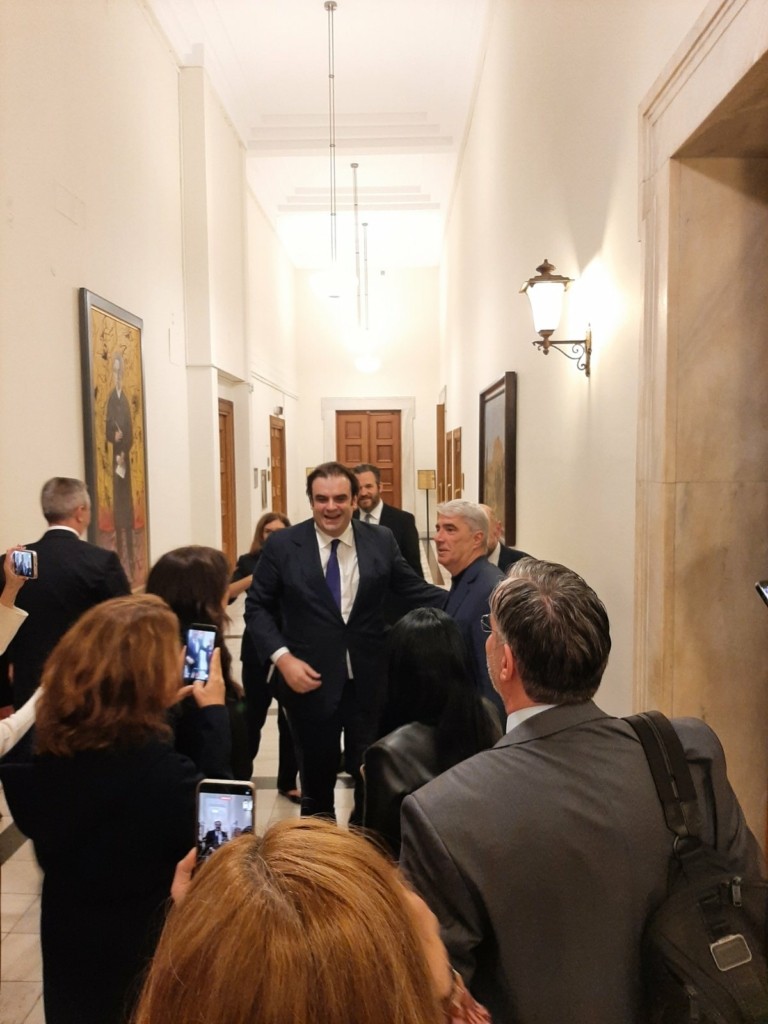 Ο κ. Πιερρακάκης έφθασε κατευθείαν από το αεροδρόμιο στη βουλή. Στην είσοδο βρέθηκαν βουλευτές για να τον συγχαρούν.