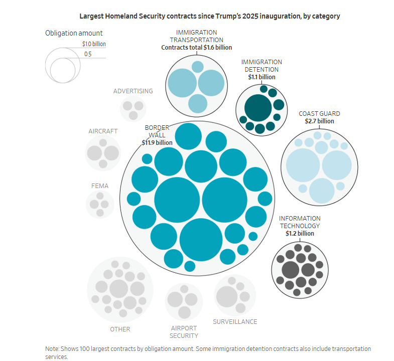Τα 100 μεγαλύτερα συμβόλαια αντιστοιχούσαν περίπου στο 60% του ποσού που είχε δεσμεύσει το DHS πέρυσι και δυνητικά θα αξίζουν πάνω από 44 δισ. δολάρια μέχρι τη στιγμή που η δεύτερη προεδρία του Τραμπ φτάσει στο τέλος της, σύμφωνα με ανάλυση της Wall Street Journal.