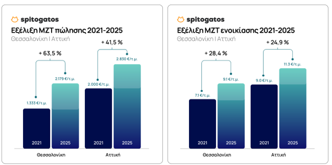 Στη Θεσσαλονίκη, σημαντική ετήσια αύξηση στη ΜΖΤ πώλησης κατοικίας σημειώθηκε το 2025 της τάξης του 11,2% σε σχέση με την προηγούμενη χρονιά, ενώ ελαφρώς μικρότερη, της τάξης του 9,2%, ήταν η αύξηση της ΜΖΤ ενοικίασης κατοικίας το 2025 σε σχέση με την προηγούμενη χρονιά.