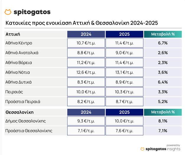 Στον τομέα της ενοικίασης, η υψηλότερη ΜΖΤ ενοικίασης κατοικίας στην Αττική εντοπίζεται στα Νότια και στα Βόρεια Προάστια ενώ όπως και στο κομμάτι της πώλησης, οι μεγαλύτερες αυξήσεις καταγράφονται στον Δήμο Αθηναίων και στα Δυτικά Προάστια, υπογραμμίζοντας την ελκυστικότητα των περιοχών αυτών κατά το 2025. Σε σχέση με την Αττική, ακόμη υψηλότερες ετήσιες αυξήσεις στη ΜΖΤ ενοικίασης κατοικίας παρατηρήθηκαν στη Θεσσαλονίκη, τόσο στον Δήμο Θεσσαλονίκης όσο και στα Προάστιά της, με αυξήσεις 8,1% και 7,1% αντίστοιχα.