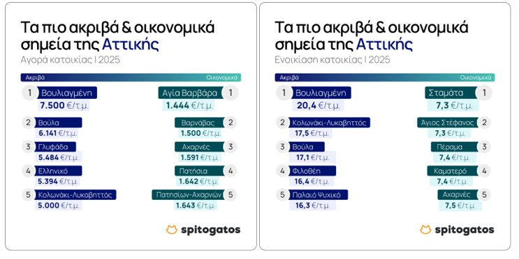 Στον αντίποδα, οι πιο οικονομικές περιοχές για αγορά κατοικίας στη Αττική για το 2025 εντοπίζονται στα Δυτικά και στα Ανατολικά Προάστια καθώς και στο κέντρο της Αθήνας. Πιο συγκεκριμένα, η Αγία Βαρβάρα αποτελεί την πιο οικονομική περιοχή της Αττικής για αγορά κατοικίας το 2025 και ακολουθούν ο Βαρνάβας, οι Αχαρνές, τα Πατήσια και η περιοχή Πατησίων-Αχαρνών. Οι πιο οικονομικές περιοχές της Αττικής για ενοικίαση κατοικίας για το 2025 είναι η Σταμάτα και ο Άγιος Στέφανος στα Βόρεια Προάστια, το Πέραμα στα προάστια του Πειραιά και το Καματερό και οι Αχαρνές στα δυτικά.