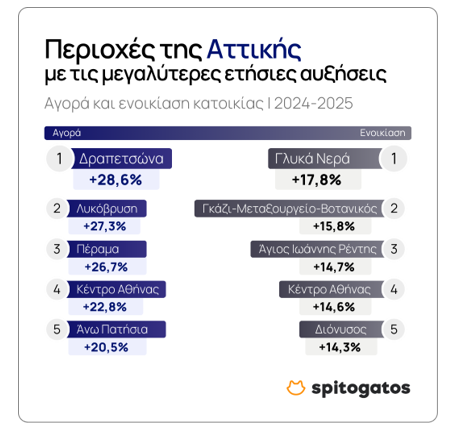 Ένα κοινό χαρακτηριστικό των περιοχών που πρωταγωνίστησαν το 2025 ως αυτές με τις μεγαλύτερες ετήσιες αυξήσεις τιμών όπως η Δραπετσώνα, το Πέραμα, τα Άνω Πατήσια, η Μενεμένη και η Μηχανιώνα είναι ότι δεν ανήκουν στις παραδοσιακά ακριβές αγορές. Το γεγονός αυτό δείχνει ότι περιοχές με χαμηλότερη αρχική βάση τιμών ανατιμώνται ταχύτερα, μειώνοντας σταδιακά την διαφορά τιμής με τις παραδοσιακά ακριβές περιοχές. Παράλληλα, ενώ το κέντρο της Αθήνας αλλά και της Θεσσαλονίκης παραμένει ελκυστικό και για πώληση και για ενοικίαση, οι μεγάλες αυξήσεις σε προάστια και δευτερεύουσες ζώνες επιβεβαιώνει ότι αγοραστές και ενοικιαστές στρέφονται όλο και περισσότερο σε πιο προσιτές περιοχές των αστικών κέντρων και των προαστίων τους για αγορά και ενοικίαση κατοικίας.