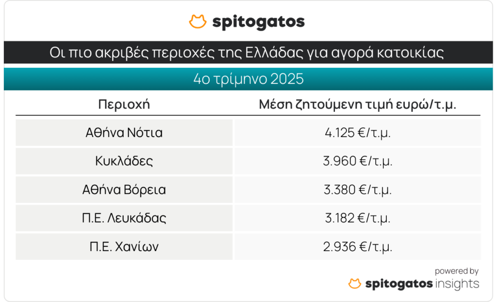 Τα πρωτεία των πιο ακριβών περιοχών της χώρας για αγορά κατοικίας συνεχίζουν να κατέχουν τα Νότια Προάστια, με ΜΖΤ στα 4.125 ευρώ/τ.μ., ενώ ακολουθούν οι Κυκλάδες και τα Βόρεια Προάστια. Το top 5 των πιο ακριβών σημείων της χώρας για αγορά κατοικίας συμπληρώνουν η Περιφερειακή Ενότητα (Π.Ε.) Λευκάδας και η Π.Ε. Χανίων, με ΜΖΤ στα 2.936 ευρώ/τ.μ.