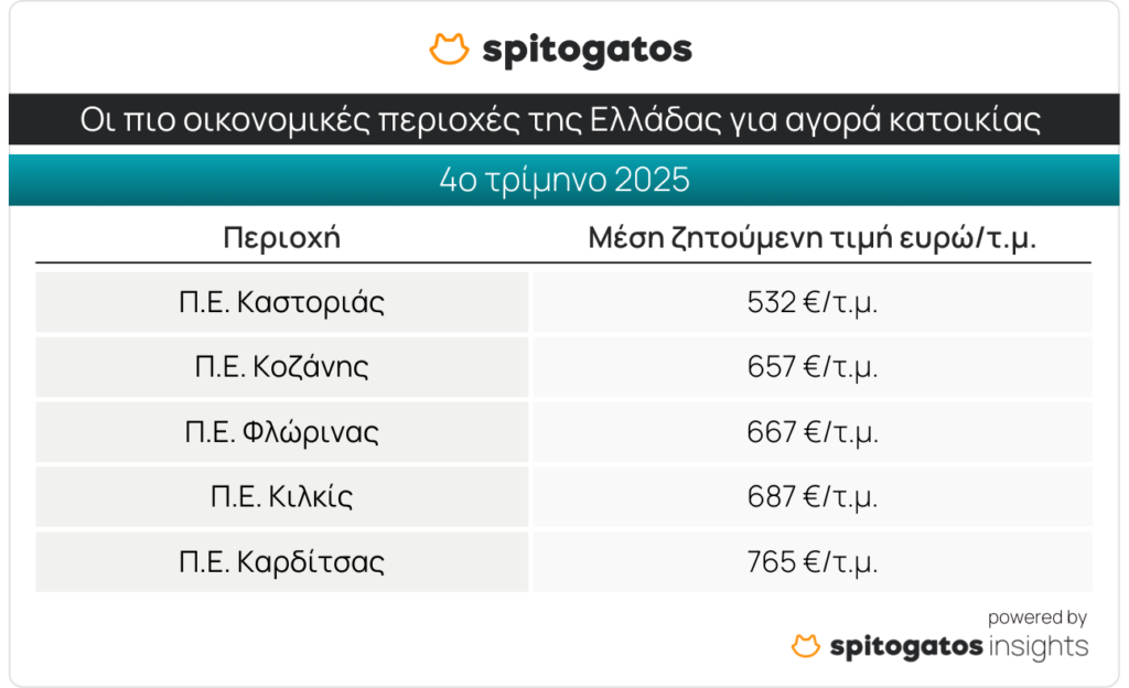 Στον αντίποδα, τα πιο οικονομικά σημεία της χώρας για αγορά κατοικίας είναι η Π.Ε. Καστοριάς με ΜΖΤ πώλησης κατοικίας στα 532 ευρώ/τ.μ., ενώ ακολουθούν οι Π.Ε. Κοζάνης, Φλώρινας, Κιλκίς και Καρδίτσας.