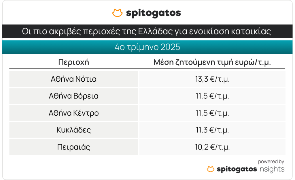 Στον τομέα της ενοικίασης κατοικίας, τα πιο ακριβά σημεία της χώρας είναι και πάλι τα Νότια Προάστια, ενώ στη 2η θέση του top 5 των πιο ακριβών περιοχών κατατάσσονται τα Βόρεια Προάστια. Ακολουθούν ο Δήμος Αθηναίων, οι Κυκλάδες και ο Πειραιάς, με ΜΖΤ ενοικίασης κατοικίας στα 10,2 ευρώ/τ.μ.