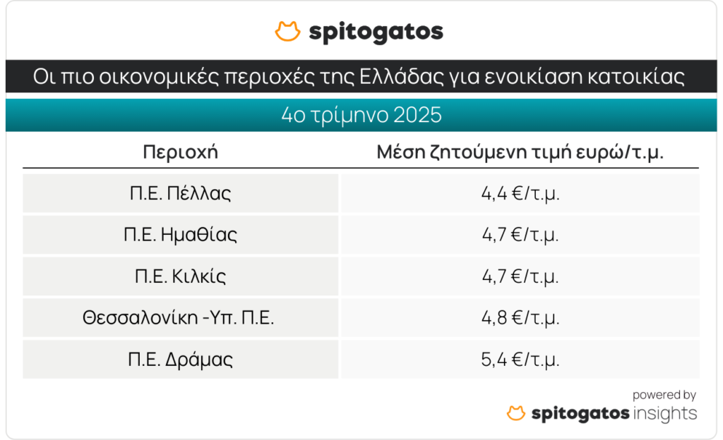 Τα οικονομικότερα σημεία της Ελλάδας για ενοικίαση κατοικίας κατά το 4ο τρίμηνο του 2025 είναι οι Π.Ε. Πέλλας, Ημαθίας, Κιλκίς, το Υπόλοιπο της Περιφερειακής Ενότητας Θεσσαλονίκης και η Π.Ε. Δράμας.