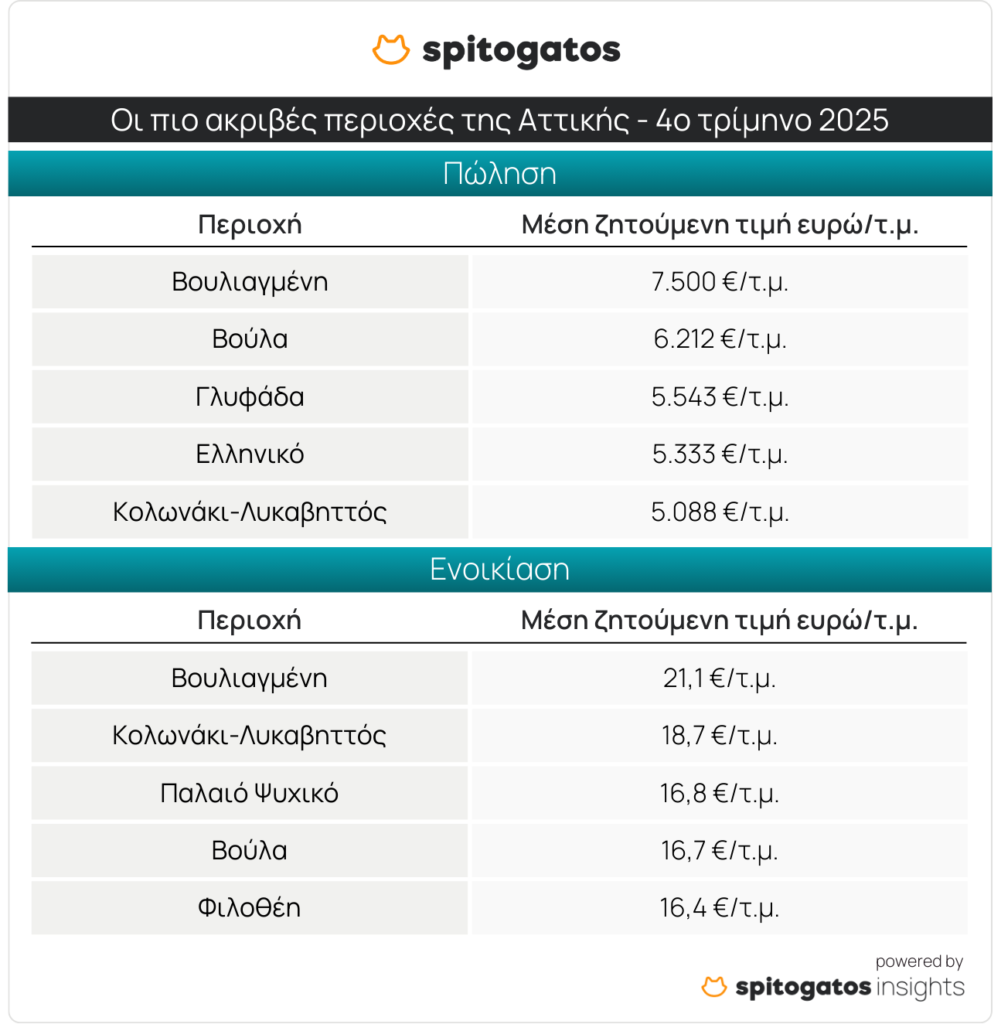 Εξετάζοντας τις ακριβότερες και τις πιο οικονομικές περιοχές για αγορά κατοικίας στην Αττική, προκύπτουν τα εξής συμπεράσματα: Σταθερά πρώτη στις ακριβότερες περιοχές παραμένει η Βουλιαγμένη, με ΜΖΤ πώλησης κατοικίας στα 7.500 ευρώ/τ.μ. Η τιμή αυτή εμφανίζει αύξηση 3,9% σε ετήσια βάση, ενώ καταγράφει μικρή μείωση της τάξης του 1,1% σε σύγκριση με το προηγούμενο τρίμηνο του 2025. Ακολουθούν οι περιοχές Βούλα, Γλυφάδα, Ελληνικό, καθώς και το Κολωνάκι-Λυκαβηττός στο κέντρο της Αθήνας, όπου οι ΜΖΤ πώλησης κατοικιών σημειώνουν ήπιες ετήσιες αυξήσεις, που κυμαίνονται μεταξύ 1,5% και 7,0%.
