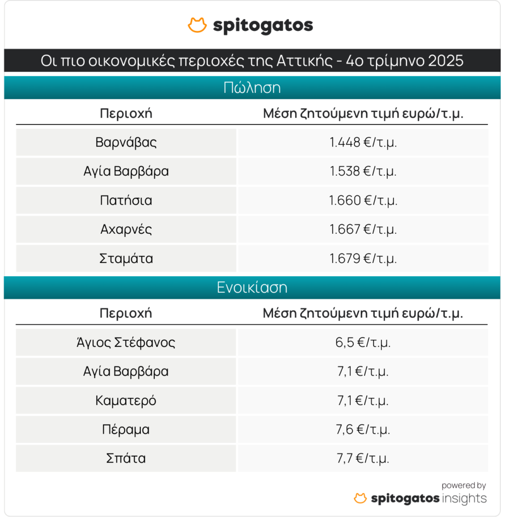 Οι πιο οικονομικές περιοχές για ενοικίαση κατοικίας στην Αττική κατά το 4ο τρίμηνο του 2025 είναι ο Άγιος Στέφανος στα Βόρεια Προάστια της Αθήνας, με ΜΖΤ στα 6,5 ευρώ/τ.μ., η Αγία Βαρβάρα και το Καματερό στα Δυτικά Προάστια, το Πέραμα στα Προάστια του Πειραιά και τα Σπάτα στην Ανατολική Αττική.