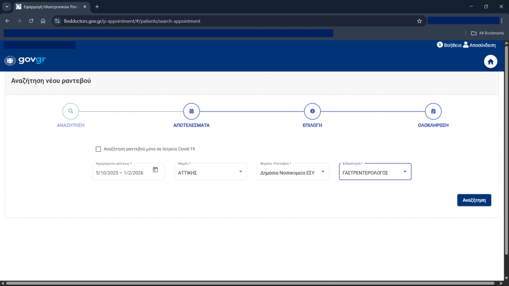 Οι επιλογές που είχαμε χθες Κυριακή 5 Οκτωβρίου το μεσημέρι στην πλατφόρμα Finddoctors.gov.gr ήταν για την περίοδο από 5 Οκτωβρίου έως και 1 Φεβρουάριου 2026.