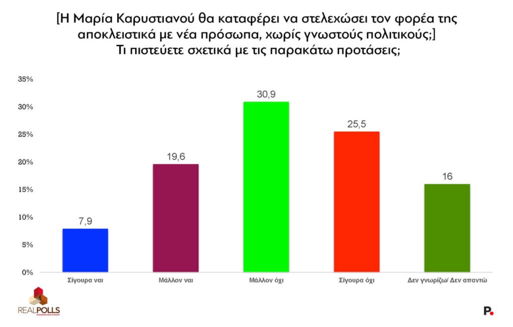 Οι πολίτες ερωτώνται και για τη δήλωση της Μαρίας Καρυστιανού ότι στο κόμμα της δεν θα συμμετέχουν άνθρωποι που έχουν ήδη πολιτευτεί με άλλα κόμματα, με το 56% να αμφιβάλλει ότι μπορεί το κόμμα Καρυστιανού να στελεχωθεί χωρίς γνωστούς πολιτικούς