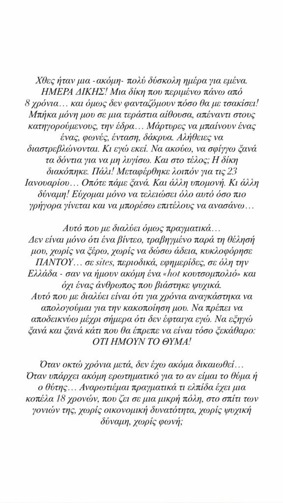 »Και στο τέλος; Η δίκη διακόπηκε. Πάλι! Μεταφέρθηκε για τις 23 Ιανουαρίου… Οπότε πάμε ξανά. Και άλλη υπομονή. Και άλλη δύναμη! Εύχομαι μόνο να τελειώσει όλο αυτό όσο πιο γρήγορα γίνεται και να μπορέσω επιτέλους να ανασάνω», πρόσθεσε.