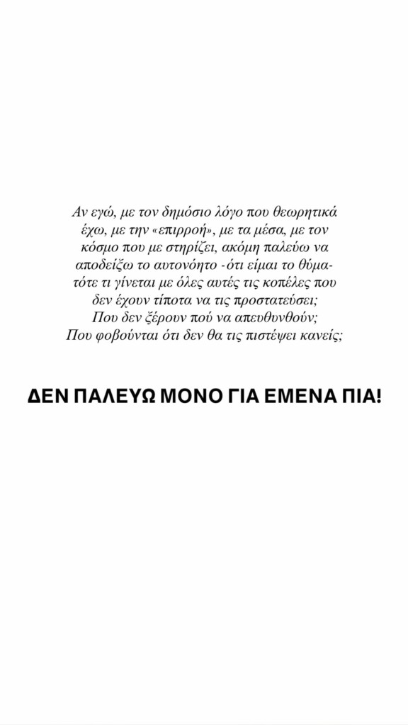 «Αυτό που με διαλύει πραγματικά, δεν είναι μόνο ότι ένα βίντεο, τραβηγμένο παρά τη θέλησή μου, χωρίς να ξέρω, χωρίς να δώσω άδεια, κυκλοφόρησε ΠΑΝΤΟΥ σε sites, περιοδικά, εφημερίδες, σε όλη την Ελλάδα- σαν να ήμουν ακόμη ένα “hot κουτσομπολιό” και όχι ένας άνθρωπος που βιάστηκε ψυχικά. Αυτό που με διαλύει είναι ότι για χρόνια αναγκάστηκα να απολογούμαι για την κακοποίησή μου. Να πρέπει να αποδεικνύω μέχρι σήμερα ότι δεν έφταιγα εγώ. Να εξηγώ ξανά και ξανά κάτι που θα έπρεπε να είναι τόσο ξεκάθαρο: ΟΤΙ ΗΜΟΥΝ ΤΟ ΘΥΜΑ!», συνέχισε.