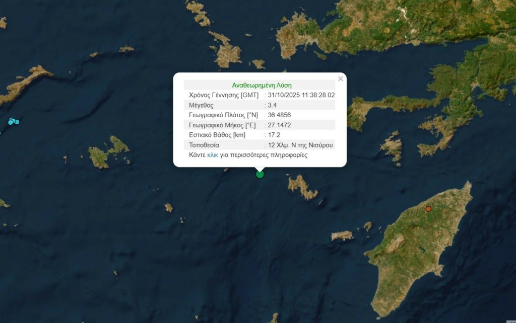 Σεισμός 3,4 Ρίχτερ σημειώθηκε το μεσημέρι της Παρασκευής σε θαλάσσια περιοχή ανοιχτά της Νισύρου.