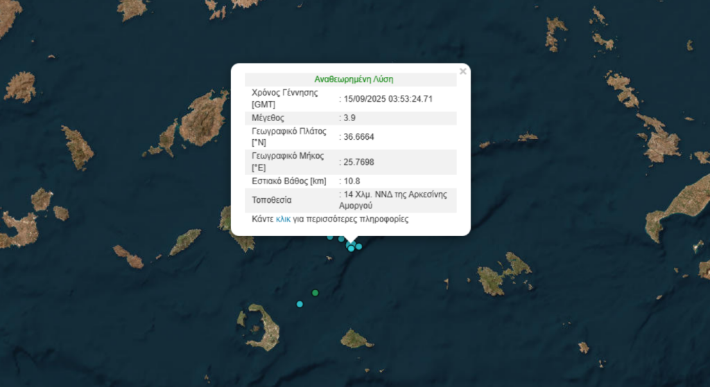 Σύμφωνα με το Γεωδυναμικό Ινστιτούτο, ο σεισμός είχε επίκεντρο 14χλμ. νότια-νοτιοδυτικά της Αρκεσίνης Αμοργού.