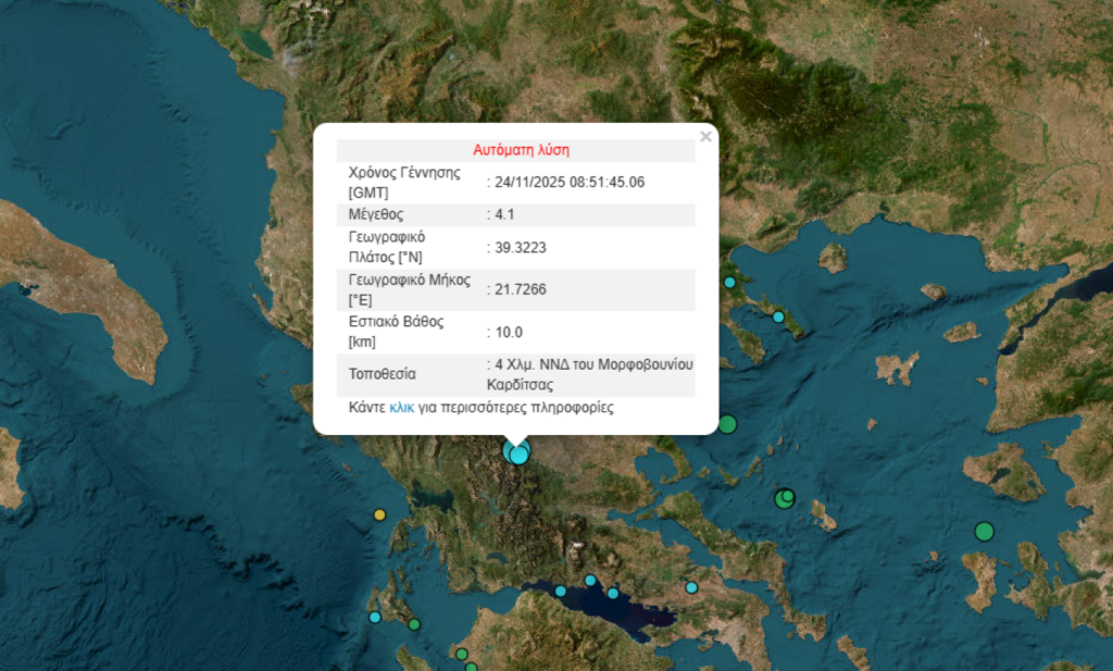 Σεισμός 4,1 Ρίχτερ σημειώθηκε το πρωί της Δευτέρας (24/11) στην Καρδίτσα.