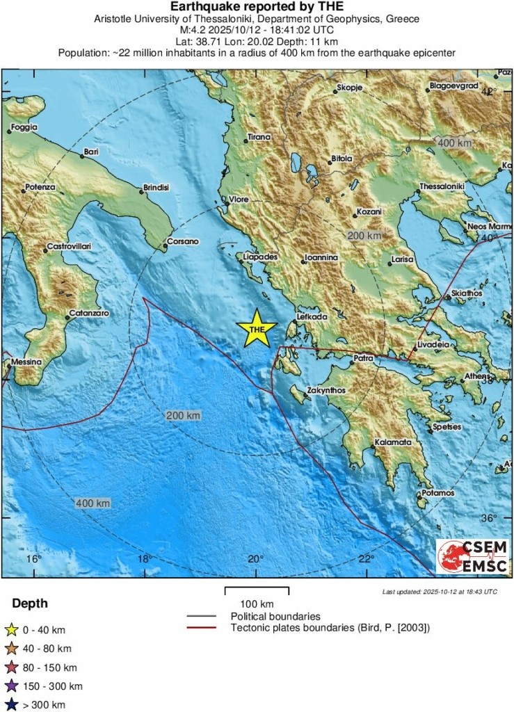 Σύμφωνα με το Ευρωμεσογειακό Σεισμολογικό κέντρο, ο σεισμός έγινε ανοιχτά της Κεφαλονιάς και της Λευκάδας.