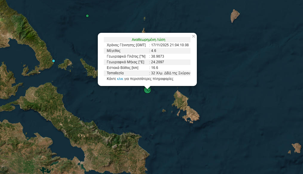 Σεισμική δόνηση μεγέθους 4,6 βαθμών της κλίμακας Ρίxτερ σημειώθηκε λίγο μετά τις 11 το βράδυ της Δευτέρας (17/11) στα ανοιχτά της Σκύρου.