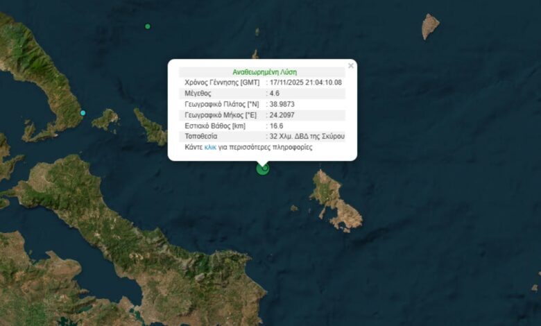 Σεισμός 4,6 Ρίχτερ στα ανοιχτά της Σκύρου, αισθητός και στην Αττική