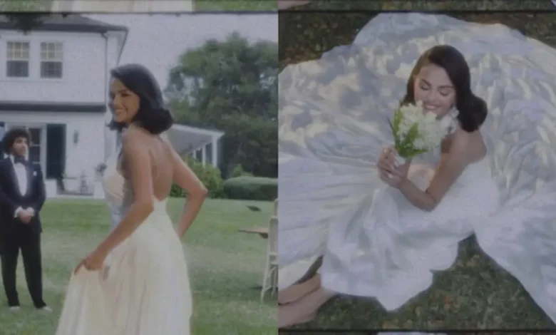 Τα καρέ, που θύμιζαν vintage εικόνες Polaroid και φιλμ, έδειχναν τη νύφη να ακτινοβολεί φορώντας ένα custom-made νυφικό Ralph Lauren με φλοράλ λεπτομέρειες, ανοιχτή πλάτη και εντυπωσιακή ουρά ενώ στα χέρια της κρατούσε μία ανθοδέσμη από μιγκέ, ένα λουλούδι που παραδοσιακά συνδέεται με την αγάπη και την νέα αρχή.