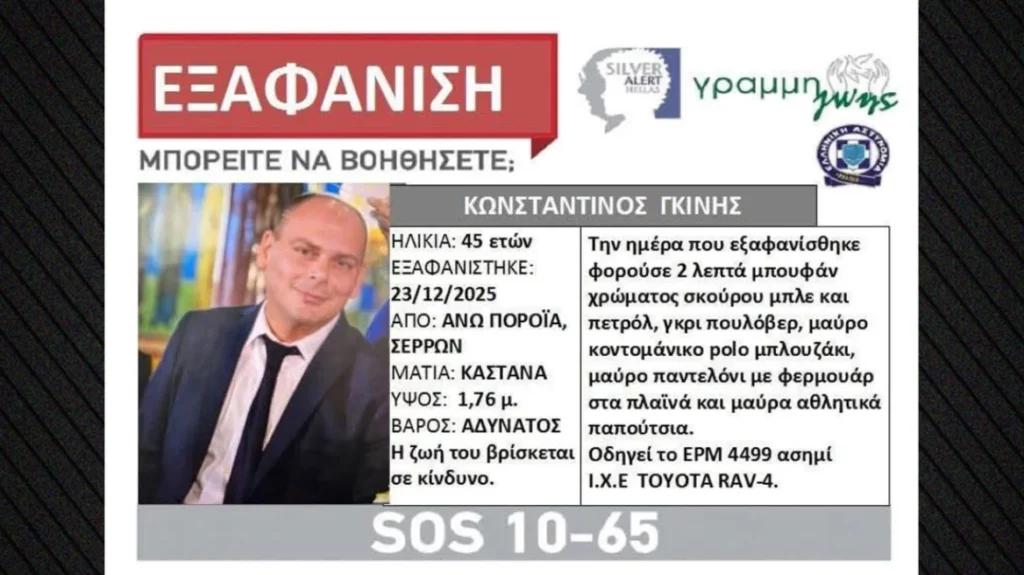 «Ο Κωνσταντίνος Γκίνης, 45 ετών, εξαφανίστηκε από το σπίτι του, στην Άνω Πορόια Σερρών, το πρωί της 23/12/25, όταν έφυγε από την οικία του προς άγνωστη κατεύθυνση και για άγνωστη αιτία με το υπ’ αριθμόν ΕΡΜ 4499 Ι.Χ.Ε όχημά του, μάρκας TOYOTA RAV-4, χρώματος ασημί. Έκτοτε αγνοείται.