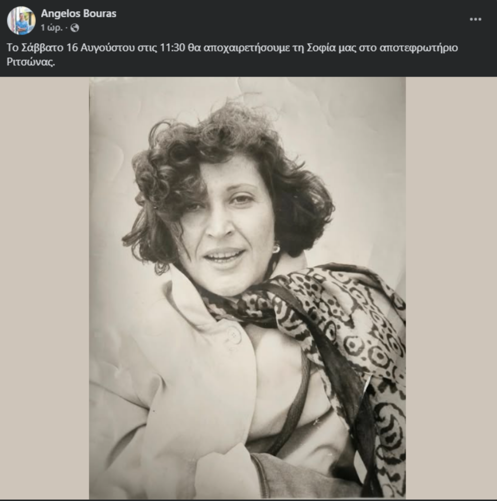«Το Σάββατο 16 Αυγούστου στις 11:30 θα αποχαιρετήσουμε τη Σοφία μας στο αποτεφρωτήριο Ριτσώνας» αναφέρεται στη σχετική ανακοίνωση.