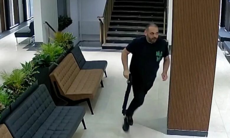 Το κλειστό κύκλωμα καταγράφει τον Atilla Ayintapli να πυροβολεί την Eser Karaca με καραμπίνα στις σκάλες του νοσοκομείου.