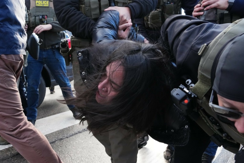 Τα λόγια της, ωστόσο, πέφτουν στο κενό, με τους πράκτορες της ICE να τη συλλαμβάνουν, ενώ το εξαγριωμένο πλήθος φώναζε εναντίον τους.
