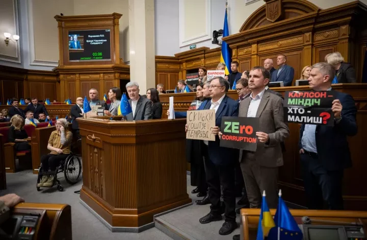 Ένα από τα δύο μεγάλα κόμματα της αντιπολίτευσης της Ουκρανίας, το κόμμα «Ευρωπαϊκή Αλληλεγγύη», εμπόδισε με φυσική παρουσία την πρόσβαση του προέδρου της Βουλής στο βήμα, και κατά συνέπεια τους βουλευτές να διεξαγάγουν χθες ψηφοφορία για την αποπομπή δύο υπουργών λόγω της έρευνας για διαφθορά, απαιτώντας αντ’ αυτού την απομάκρυνση ολόκληρου του υπουργικού συμβουλίου.