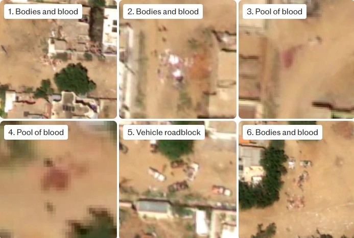 Οι σοκαριστικές εικόνες, που αναλύθηκαν από το Εργαστήριο Ανθρωπιστικής Έρευνας του Πανεπιστημίου Yale και δημοσιεύθηκαν από την εφημερίδα The Telegraph, δείχνουν λίμνες αίματος και σωρούς πτωμάτων, ορατά από το διάστημα.