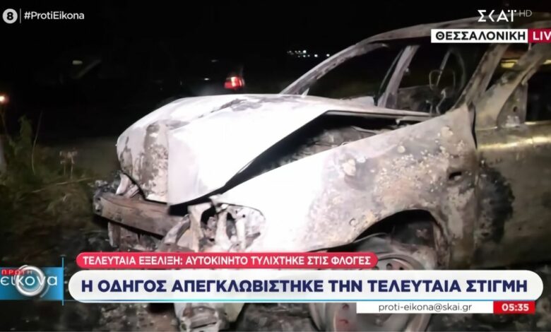 Σοβαρό τροχαίο στη Θεσσαλονίκη: ΙΧ «καρφώθηκε» σε κολόνα και τυλίχθηκε στις φλόγες – Σώα η οδηγός (video)