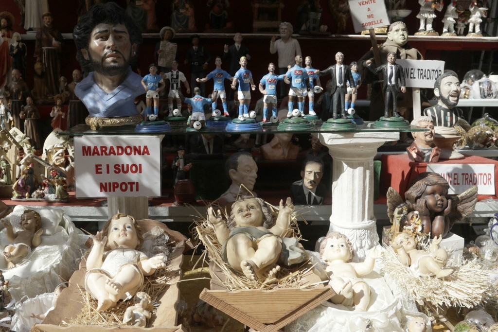 Ράφια γεμάτα με Θεία Βρέφη σε κούνιες με άχυρο, μινιατούρες γαϊδουριών και προβάτων και οι Τρεις Μάγοι, με περίτεχνα στολίδια, τοποθετούνται δίπλα σε κάθε λογής φιγούρες του Μαραντόνα, προ(σ)καλώντας τους επισκέπτες να τ’ αποκτήσουν ως σουβενίρ του ταξιδιού τους στη Νάπολη.