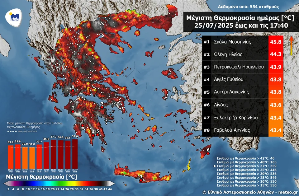 Όπως προκύπτει από σχετικό χάρτη, η θερμοκρασία ξεπέρασε τους 37 °C σε 359 από τους 554 ενεργούς σταθμούς, τους 40 °C σε 165 σταθμούς και τους 42 °C σε 46 σταθμούς. Τέλος, η μέση μέγιστη θερμοκρασία στην επικράτεια ήταν η υψηλότερη των τελευταίων ημερών, φτάνοντας τους 37.6°C..