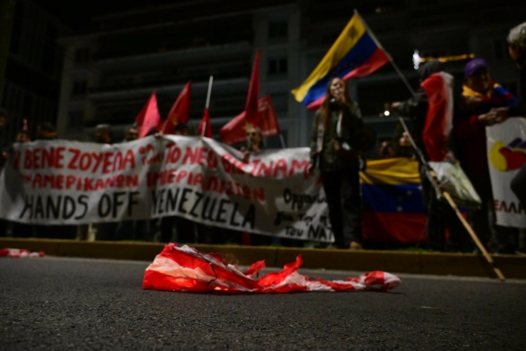 Οι διαδηλωτές φώναξαν συνθήματα υπέρ της Βενεζουέλας και κατά των ΗΠΑ, ενώ έκαψαν και αμερικανικές σημαίες.