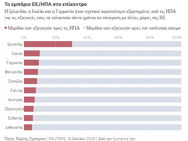 Τέλος, σε επίπεδο χωρών, σύμφωνα με τον παρακάτω πίνακα, Ιρλανδία, Γερμανία και Ιταλία είναι αυτές που έχουν το μεγαλύτερο ποσοστό εξαγωγών προς τις ΗΠΑ, οπότε εκτιμάται ότι θα υποστούν και το μεγαλύτερο πλήγμα από τους νέους δασμούς.