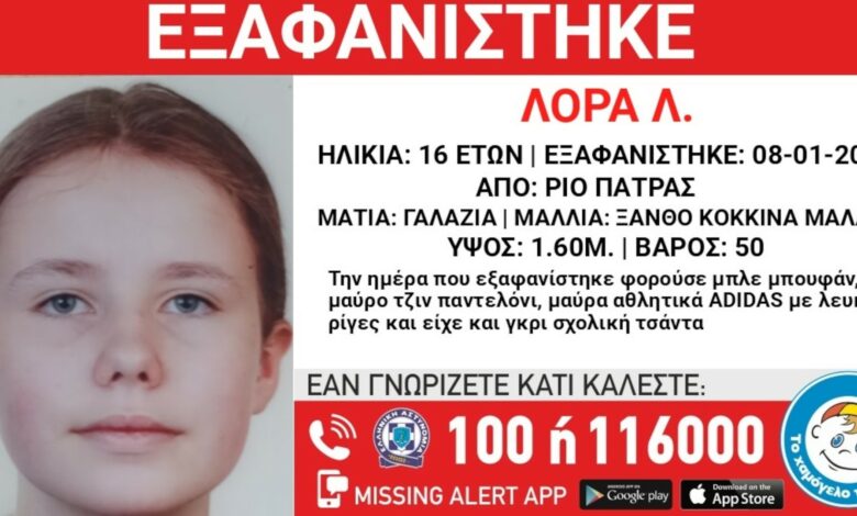 Συναγερμός σήμανε νωρίς το πρωί της Πέμπτης, 8/1, στην περιοχή του Ρίου στην Πάτρα, για την εξαφάνιση της 16χρονης Λόρα Λ., γερμανικής καταγωγής.