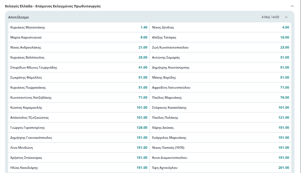 Το περίεργο δεν είναι ότι δίνει φαβορί τον Κυριάκο Μητσοτάκη (με απόδοση μόλις 1.40) καθώς όλες οι δημοσκοπήσεις καταγράφουν τον πρωθυπουργό τον πιο πιθανό νικητή στις επόμενες εκλογές.