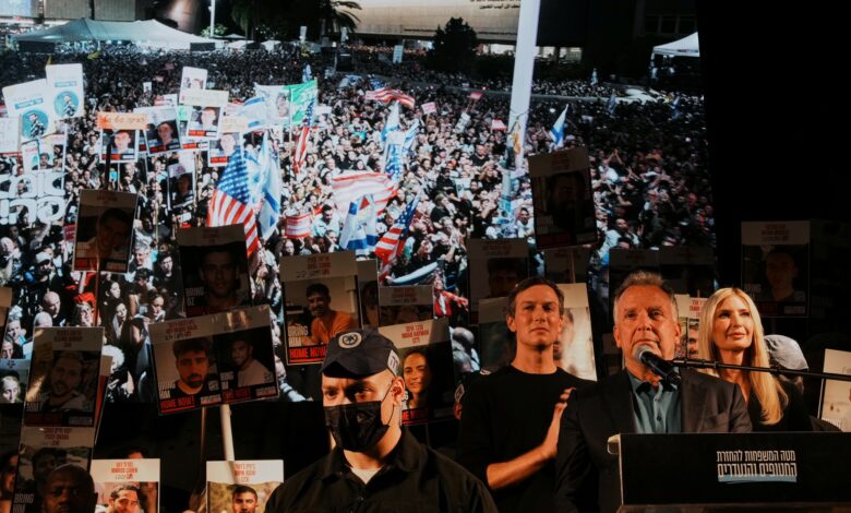 Ο Στίβ Γουίτκοφ, ο Τζάρεντ Κούσνερ, γαμπρός του Ντόναλντ Τραμπ, και η σύζυγός του Ιβάνκα Τραμπ, μίλησαν όλοι σε αυτό που οι διοργανωτές χαρακτήρισαν ως το «τελευταίο» τέτοιο συλλαλητήριο για τους ομήρους, εκφράζοντας την ελπίδα ότι όλοι θα έχουν απελευθερωθεί έως τη Δευτέρα.