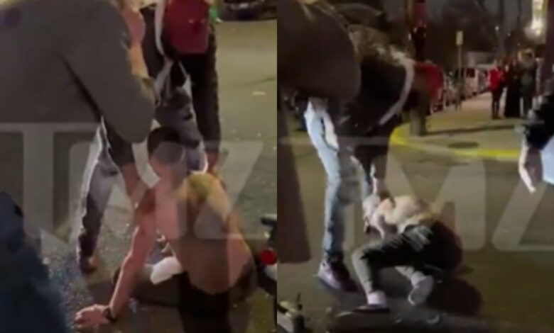 Ο ηθοποιός σέρνεται στην άσφαλτο και προσπαθεί να χτυπήσει ομάδα ανδρών που βρίσκεται από πάνω του και τον έχει ακινητοποιήσει.