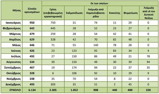 Αξιοσημείωτο είναι ότι στη δεύτερη θέση της λίστα με τα λοιμώδη νοσήματα συχνότητα εμφάνισης ήταν πέρυσι η σαλμονέλωση (1.052 κρούσματα).