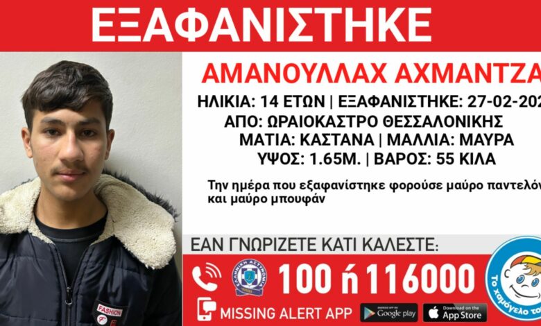 Στις 27/03/2026 και ώρα 12:00 το μεσημέρι, εξαφανίστηκε από χώρο φιλοξενίας ασυνόδευτων ανηλίκων στην περιοχή του Ωραιοκάστρου Θεσσαλονίκης, ο Αμανουλλάχ Αχμαντζάι, 14 ετών, Αφγανικής καταγωγής.
