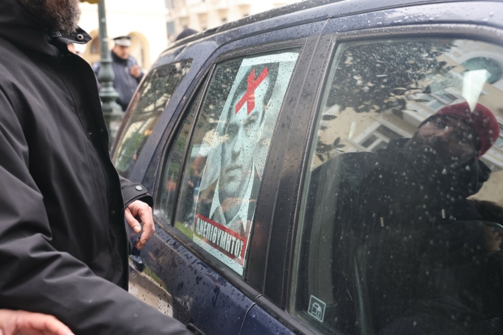 Οι συλληφθέντες πέταξαν τρικάκια έξω από το κινηματοθέατρο με το πρόσωπο του Αλέξη Τσίπρα, και αναγράφοντας «ανεπιθύμητος».