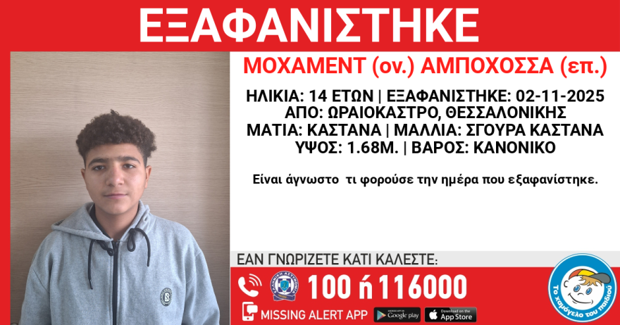 Εξαφανίστηκε από χώρο φιλοξενίας στο Ωραιόκαστρο Θεσσαλονίκης την Κυριακή, ένας 14χρονος αιγυπτιακής καταγωγής.
