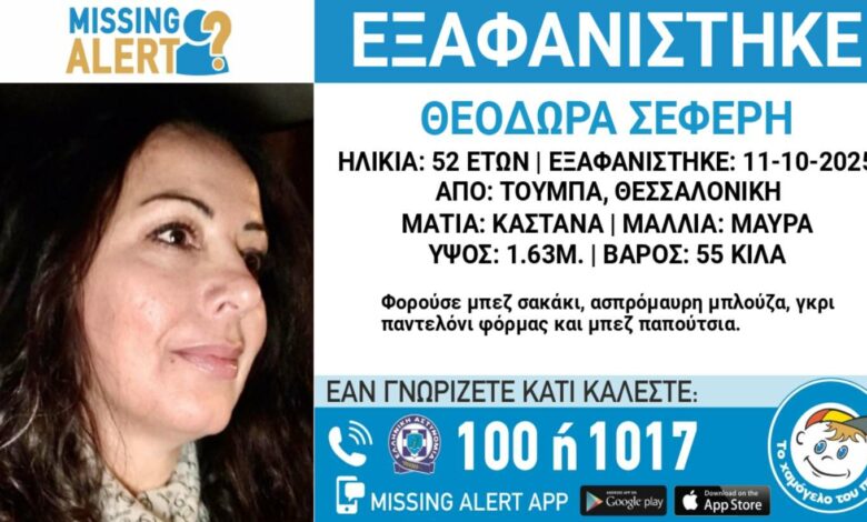 «Το Χαμόγελο του Παιδιού» ενημερώθηκε σήμερα, 12/10/2025, για την εξαφάνιση της Θεοδώρας Σεφέρη και προχώρησε στη δημοσιοποίηση των στοιχείων της ενήλικης κατόπιν αιτήματος της οικογένειας της, καθώς ενδέχεται να συντρέχουν λόγοι οι οποίοι θέτουν τη ζωή της σε κίνδυνο.
