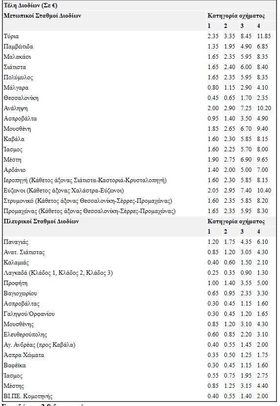 Αναλυτικά, οι τιμές ανά μετωπικό και πλευρικό σταθμό διοδίων θα διαμορφωθούν ως εξής: